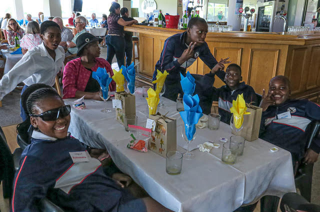 Sist men mest - vi hade 6 pigga och nyfikna barn ur vår grupp i ACJ Phakade, ledsagade av Thuli och Herbert. De började sitt besök hos oss med en golf lektion hos Klubbens pro Helena Buitentag, sen blev det mat och en presentbag att ta med hem, 1 bok, lite godis mm. Kanske tyckte de att middagen som de strax fick hämta tillsammans med alla spelare var det bästa. Jättegod mat tyckte de och vi alla. Heder och Tack åt Rowan, the Chef! Och Tack Imibala och Imibala barnen för att Ni kom pratade, busade, fnittrade och förgyllde vår dag. Härligt!